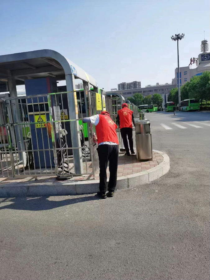志愿者在車站開(kāi)展清掃垃圾、撿拾煙頭、擦洗場(chǎng)站圍欄等活動(dòng),進(jìn)一步提升城市文明窗口形象
