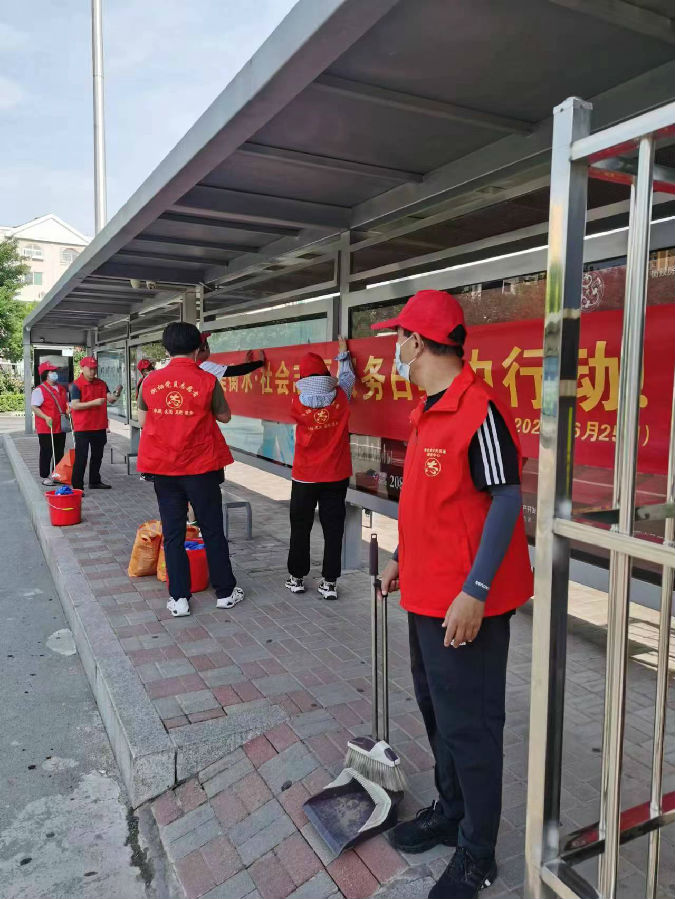 志愿者擦洗重要公交樞紐站站亭,進(jìn)一步提升公交候乘環(huán)境。