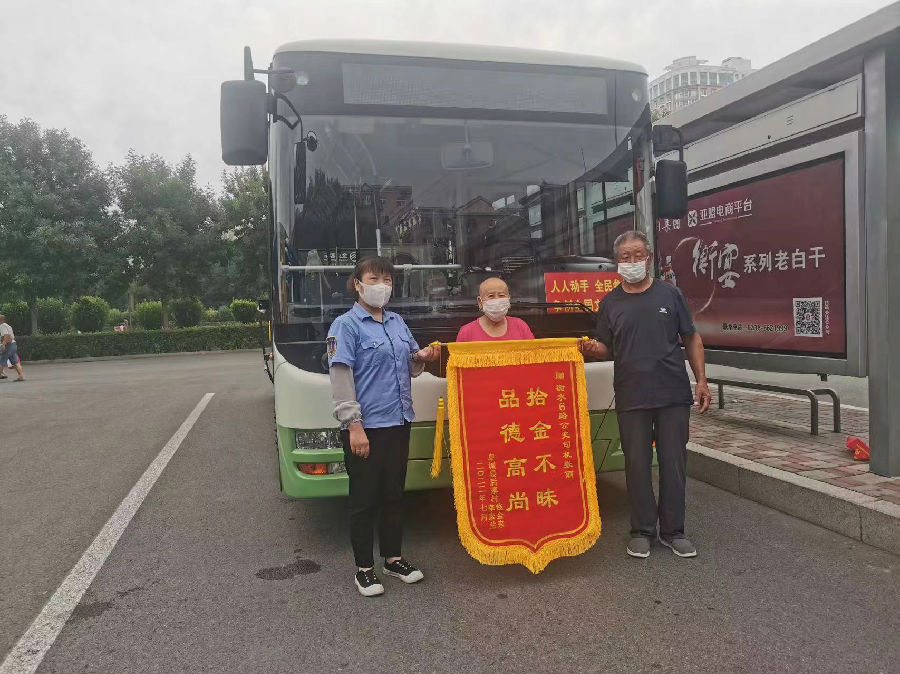7月19日上午,一對年過七旬的老夫妻專程從阜城后寨村趕來衡水火車站公交樞紐站,親手將一面印有“拾金不昧 品德高尚”的錦旗送到6路車長張麗手中,感激之情,溢于言表。