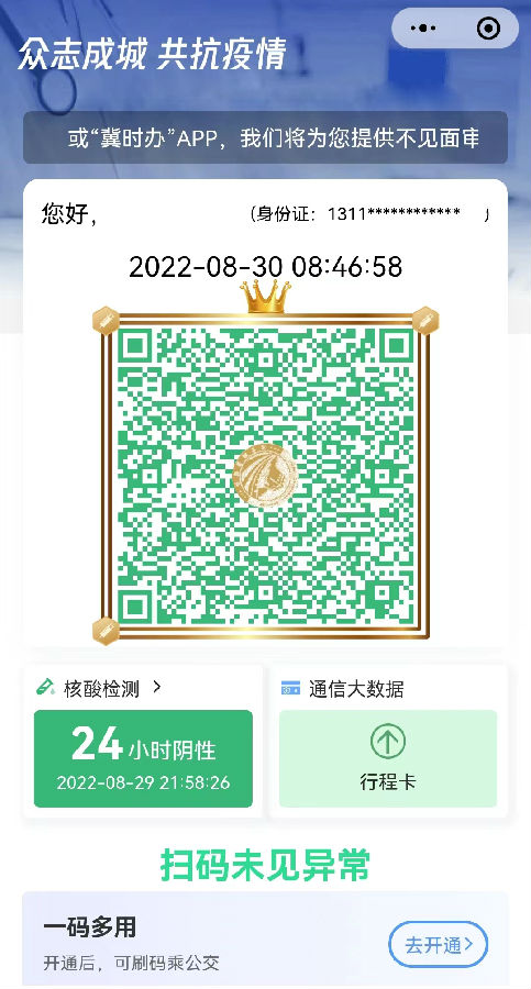 乘客通過微信、支付寶“掃一掃”功能掃描公交車上張貼的“場所碼”“河北健康碼”“行程卡”“核酸檢測證明”的結(jié)果均能在頁面中顯示,乘客將顯示有“掃碼未見異!钡慕Y(jié)果交與公交駕駛員查驗(yàn)即可。同時,針對無智能手機(jī)或不能使用掃碼系統(tǒng)的老人、兒童等特殊群體,繼續(xù)保留查驗(yàn)身份證進(jìn)行手工登記的措施。